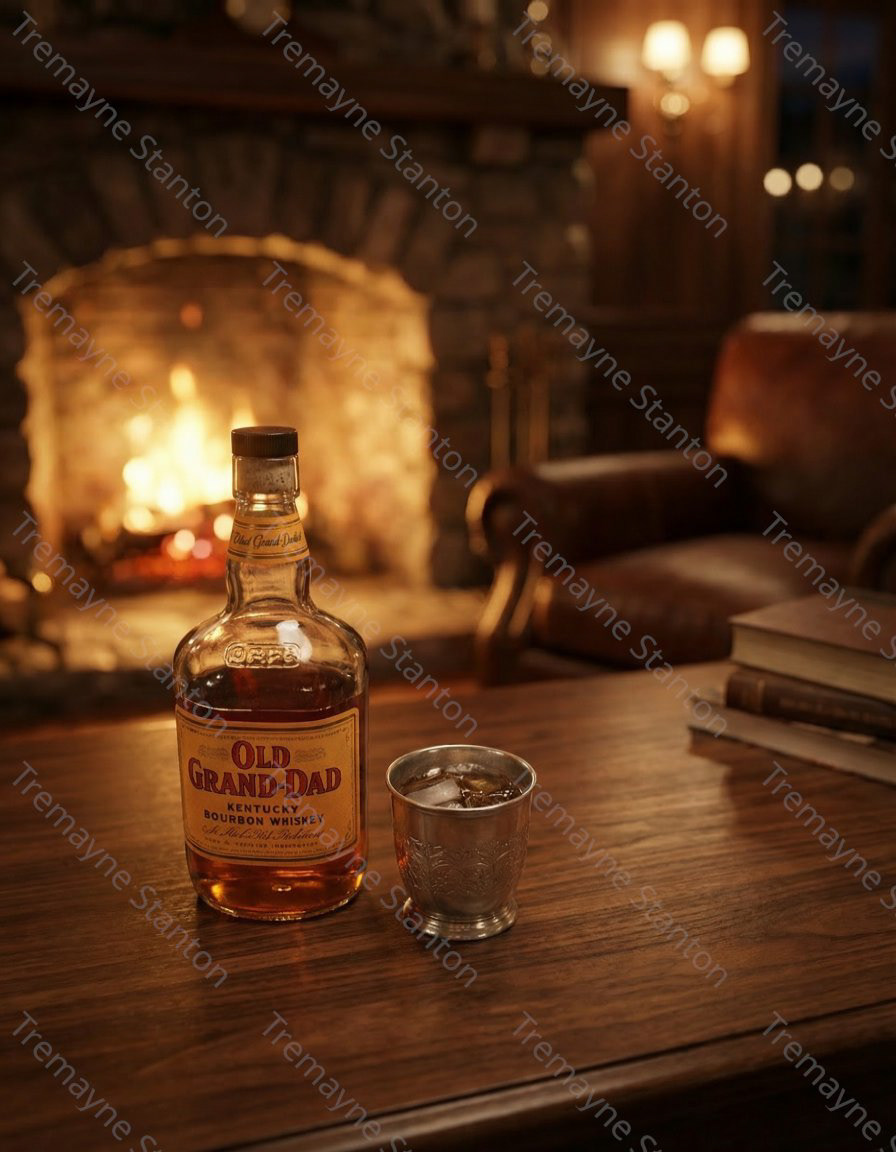 I replaced the background with a luxury dark walnut lounge and added a warm, glowing fireplace bokeh.