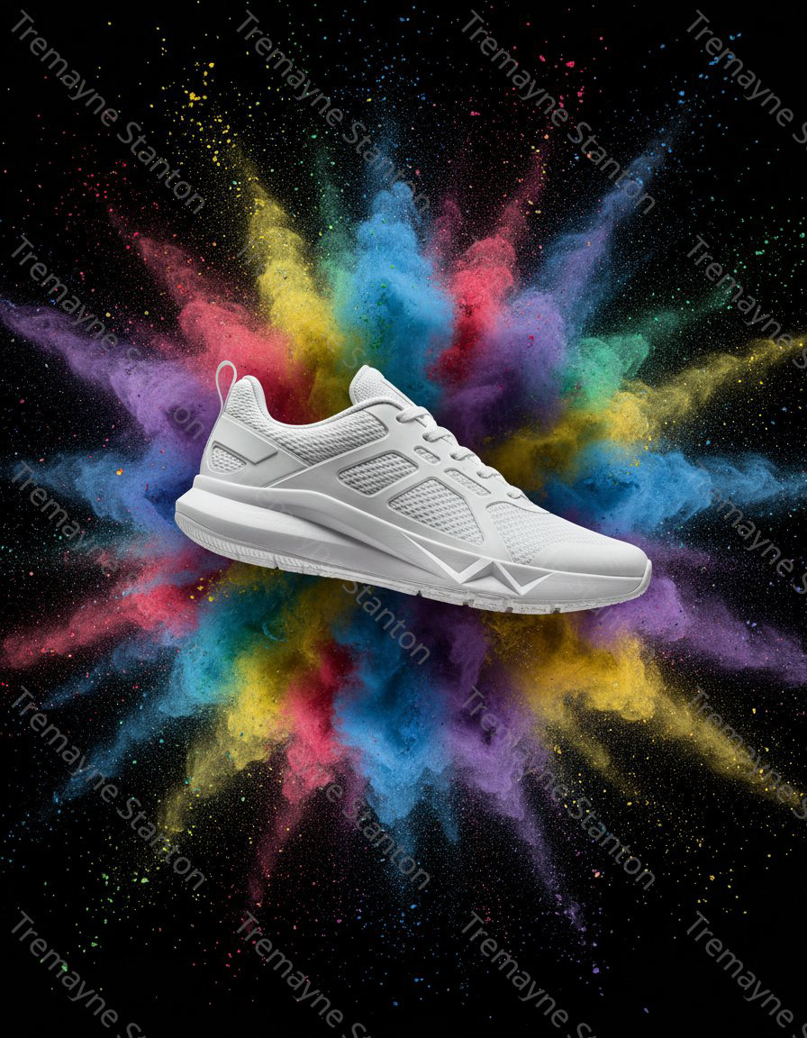 I "suspended" the shoe in mid-air and added a vibrant powder explosion to signal energy and movement.