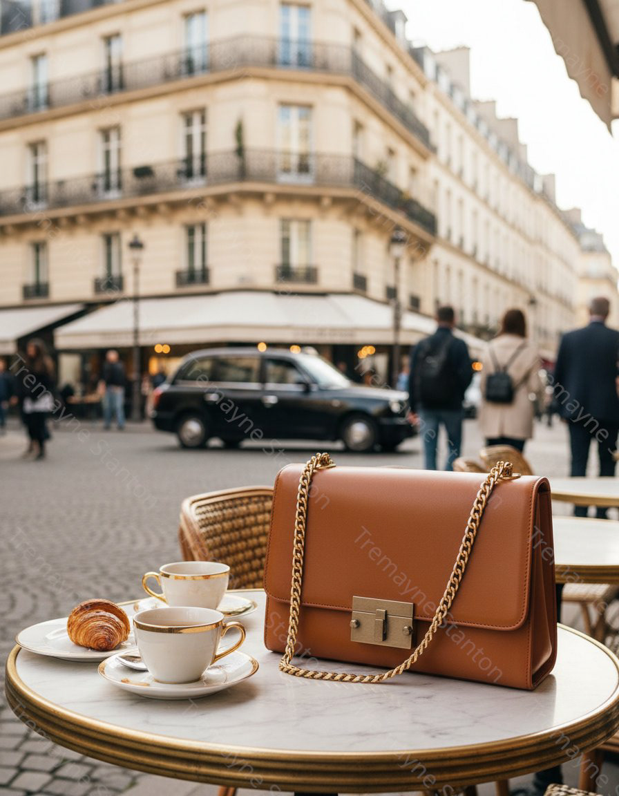 I placed the bag in an elegant Paris cafe setting with a blurred street background for a "lifestyle" feel.