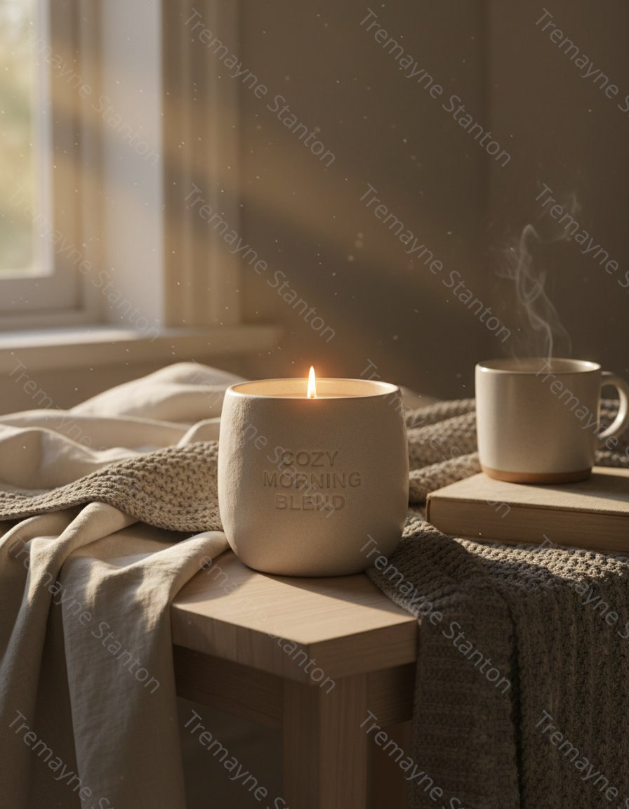 I styled the candle on a clean bedside table with soft linens and cozy, natural morning light.